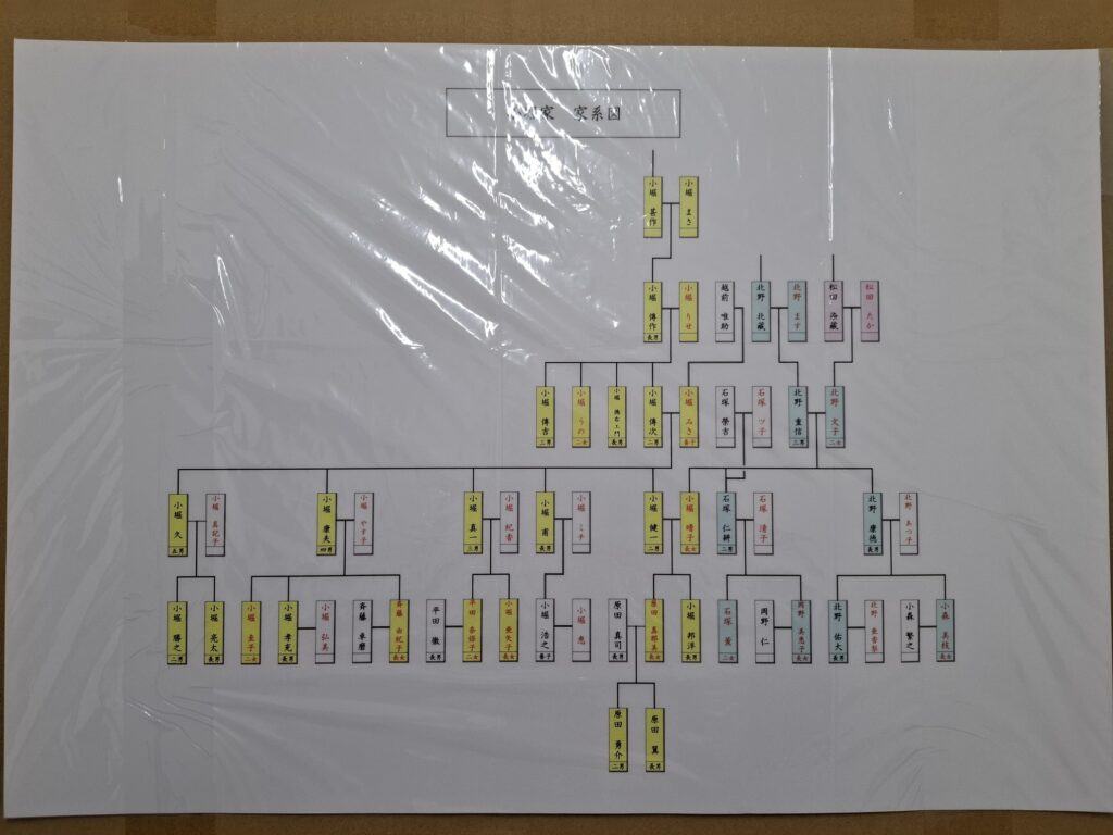 上の家系図のサイズは A2(新聞紙1面くらい)ですが、最大で A1(さらに2倍の大きさ) まで対応可能です。